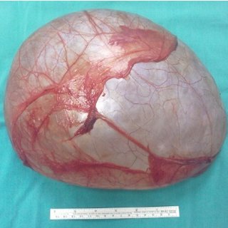 Yandaki resimde 25 cm boyutuna kadar ulaşmasına rağmen hastada karında şişkinlik harici bir şikayet yaratmamış olan iyi huylu bir over kistinin ameliyatla çıkarılması izlenmektedir.